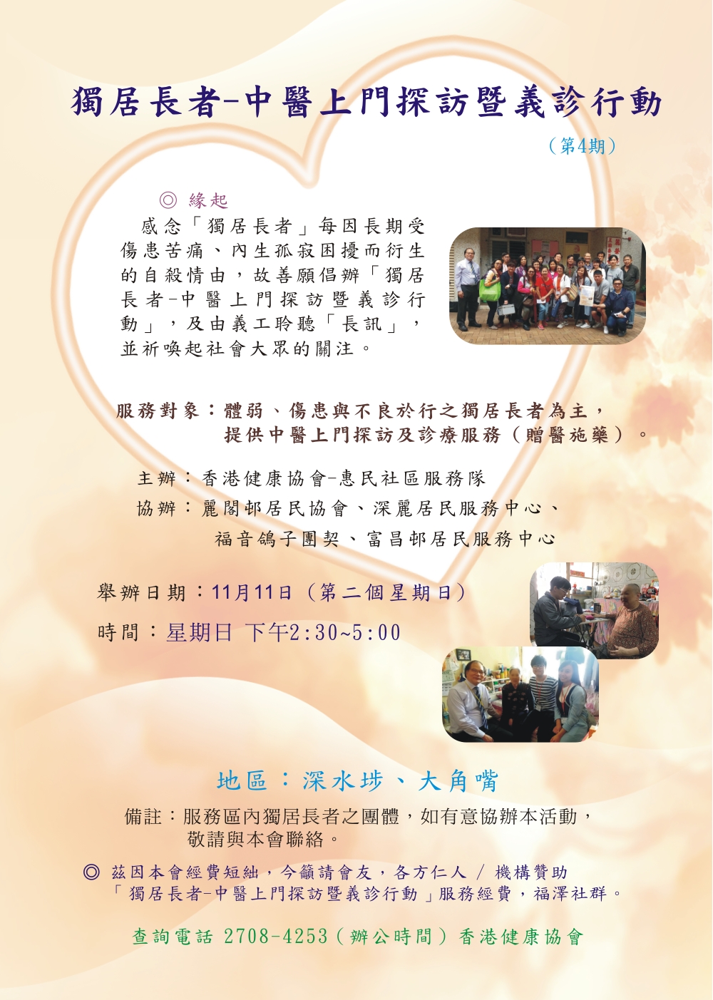 本會惠民社區服務隊於4月15日在深水埗舉辦「獨居長者-中醫上門義診服務」。