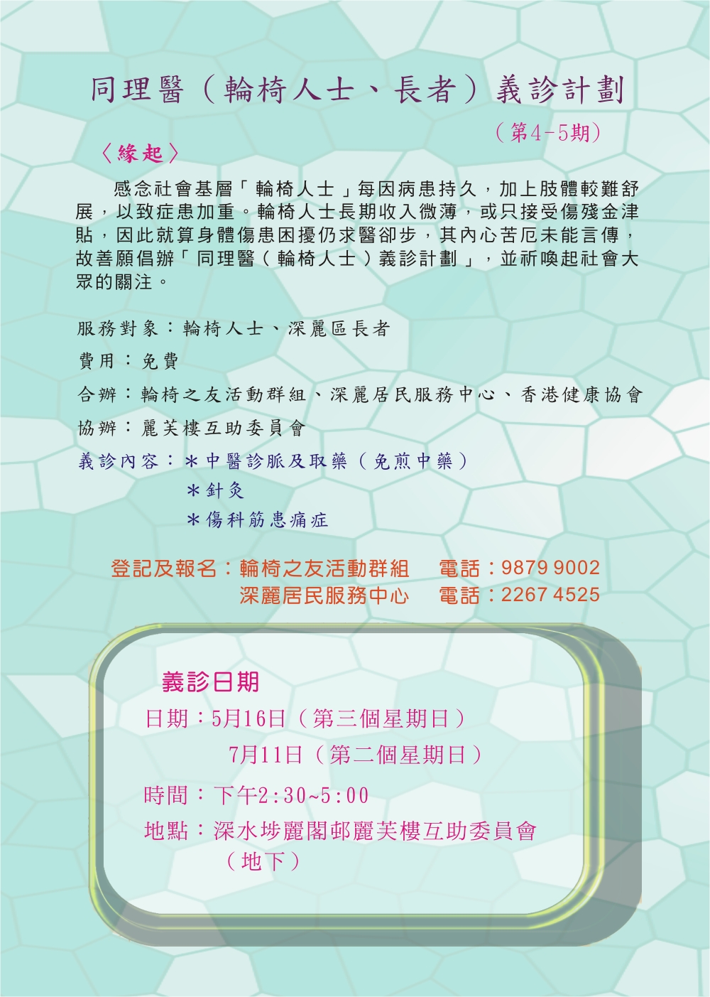 ![]() 今期義診服務由:陳飛鳳、葉家俊、陳愛心、黃峻偉、陳蔡群五位醫師應診 |